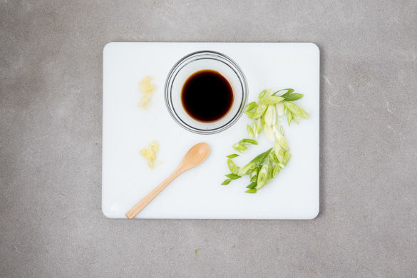 Den Knoblauch und den Ingwer schälen und fein hacken oder reiben, beides mit der Sojasauce verrühren. Die Lauchzwiebel schräg in dünne Ringe schneiden.