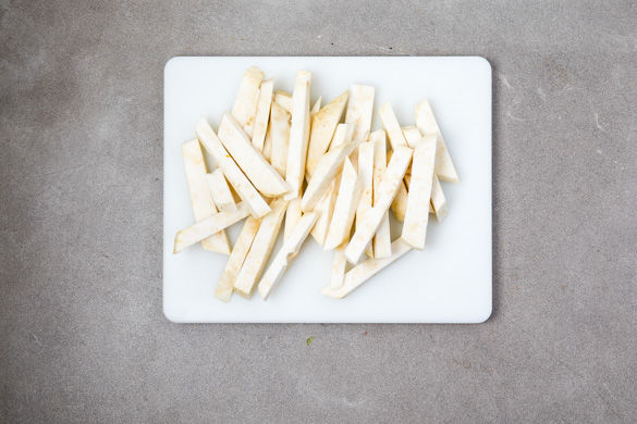 Den Sellerie schälen und in ca. 1cm dünne Scheiben schneiden, anschließend die Scheiben in ca. 1cm dicke Stifte schneiden.