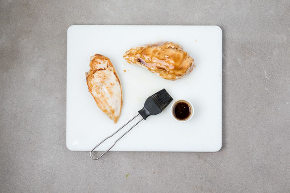 Das Hähnchen in einer mittelgroßen Pfanne mit 1–2EL Öl auf jeder Seite ca. 2–4Min. scharf anbraten, mit Teriyakisauce bepinseln, auf ein mit Backpapier ausgelegtes Backblech geben und im Ofen für ca. 5–8Min. garen, bis es in der Mitte durch ist. Tipp: Je nach Dicke des Fleisches kann die Garzeit variieren. Nach ca. 4Min. erneut mit Teriyakisauce bepinseln.