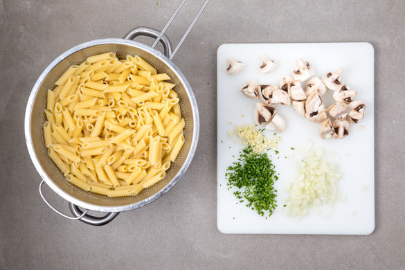 Den Schnittlauch in feine Röllchen schneiden. Die Zwiebel schälen, halbieren und fein würfeln. Den Knoblauch schälen und fein hacken. Die Champignons ggf. säubern, dann je nach Größe vierteln oder achteln. Sobald das Wasser kocht, die Pasta hineingeben und ca. 7–8Min. kochen lassen, bis sie bissfest ist. In ein Sieb abgießen und abtropfen lassen.
