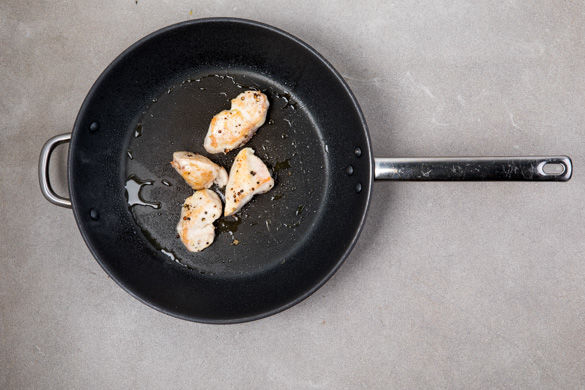 Das Hähnchen in einer großen Pfanne mit 2EL Olivenöl bei hoher Hitze für ca. 1Min. von jeder Seite scharf anbraten. Herausnehmen und beiseitestellen.