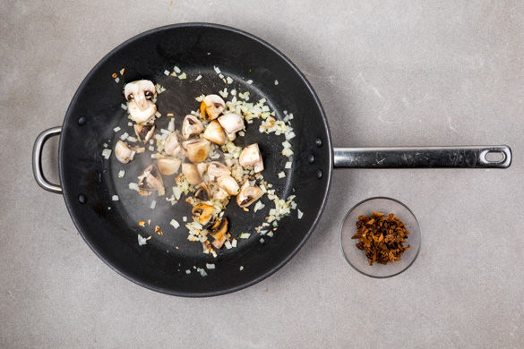 Die Champignons, die Zwiebeln und den Knoblauch in derselben Pfanne mit 1–2EL Olivenöl für 2–3Min. bei mittlerer Hitze anbraten. Die Steinpilze aus der Brühe nehmen und fein hacken. Die Pilzbrühe aufbewahren.