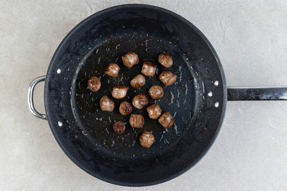 Die Würste in ca. 1cm dicke Scheiben schneiden, nach Belieben salzen und pfeffern und in derselben Pfanne mit 1EL Olivenöl bei starker Hitze 3–4Min. scharf anbraten. Auf einem Teller beiseitestellen, die Pfanne nicht auswischen.