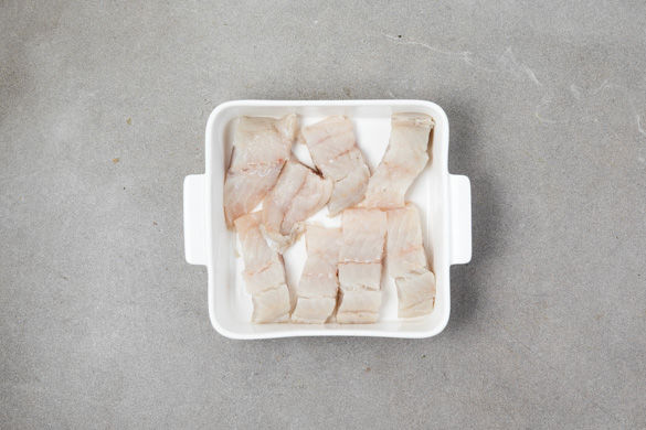 Den Backofen auf 150°C Umluft (170°C Ober-/Unterhitze) vorheizen. Den Seelachs mit etwas Küchenkrepp trocken tupfen, in 8 gleich große Stücke schneiden und in eine Auflaufform legen. Tipp: Den Fisch vorher auf mögliche Gräten untersuchen und diese mit einer Pinzette entfernen oder beim Essen darauf achten!