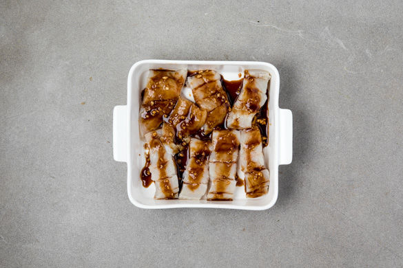 Den Knoblauch schälen und fein hacken. Die 1/2 der Tamarindenpaste mit dem Knoblauch und der Sojasauce verrühren und über den Fisch geben. Den Fisch für ca. 12–15Min. im Ofen backen, bis er in der Mitte durchgegart ist. Die restliche Paste wird nicht weiter benötigt.