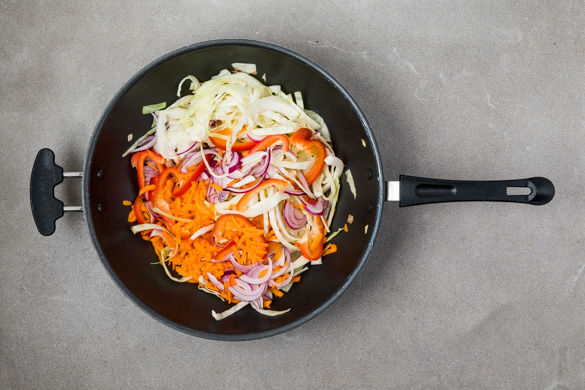 Den Weißkohl in einer großen Pfanne oder in einem Wok mit 1–2EL Pflanzenöl bei hoher Hitze ca. 3–4 Min scharf anbraten. Die Paprika, die Karotten und die Zwiebeln dazugeben und das Gemüse für weitere 3–5Min. braten.