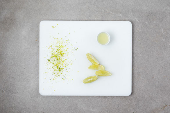 Die Limettenschale abreiben und die Limette halbieren. Eine Limettenhälfte auspressen, die andere Hälfte in Spalten schneiden.