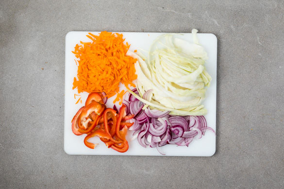 Die Zwiebeln schälen, halbieren und in dünne Halbringe schneiden. Den Weißkohl vom Strunk befreien und in 0,5cm dünne Streifen schneiden. Die Karotten schälen und grob raspeln. Die Paprika vierteln, entkernen und in dünne Streifen schneiden.