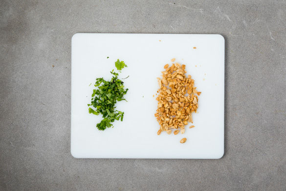 Den Fisch aus der Auflaufform nehmen und den ausgetretenen Saft über das Gemüse geben. Das Gemüse mit Limettenabrieb, -saft und Salz abschmecken. Den Koriander und die Erdnüsse hacken. Das Gemüse mit dem Fisch anrichten und mit dem Koriander und den Erdnüssen garniert servieren. Die Limettenspalten nach Geschmack über dem Fisch auspressen.
