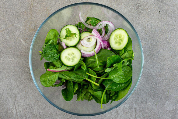 Die Gurke in dünne Scheiben schneiden. Die Zwiebel schälen und halbieren, eine Hälfte in feine Streifen schneiden, die andere Hälfte für ein anderes Rezept aufbewahren. Die Gurken, die Zwiebeln und den gemischten Salat vermengen.