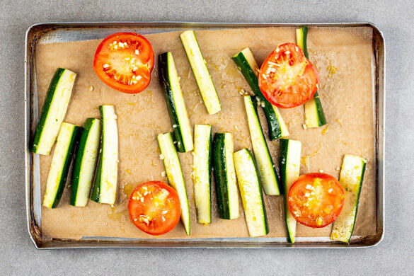 Die Zucchini erst längs, dann quer halbieren und in ca. 1cm dicke Spalten schneiden. Die Zitronenschale abreiben. Den Knoblauch schälen und fein würfeln. Die Tomaten halbieren und mit der Zucchini auf einem mit Backpapier ausgelegten Blech verteilen, mit der Zitronenschale, dem Knoblauch, 1EL Olivenöl und je 1 Prise Salz und Pfeffer würzen und ca. 10Min. im Ofen backen.