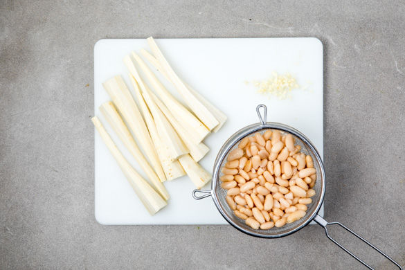 Den Backofen auf 200°C Umluft (220°C Ober-/Unterhitze) vorheizen. Die Pastinaken putzen, schälen und der Länge nach vierteln, ggf. größere Stücke erneut halbieren. Den Knoblauch schälen und fein hacken. Die Bohnen in einem Sieb abgießen und kurz unter kaltem Wasser abspülen.
