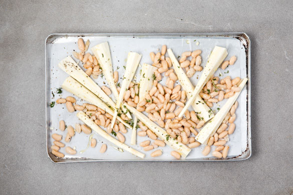 Die Thymianblätter von den Stängeln zupfen. Die Pastinaken, den Knoblauch und die Bohnen auf ein mit Backpapier ausgelegtes Backblech geben und mit den Thymianblättern, 1EL Olivenöl, Salz, und Pfeffer vermengen. Das Gemüse für 15–25Min. in den Ofen geben und nach der Hälfte der Zeit einmal wenden.