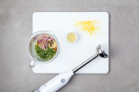 Die Schalotte schälen und grob würfeln. Die Zitrone abreiben und auspressen. Die Petersilienblätter abzupfen, die Stiele grob hacken. Die Misopaste, 1–2EL gehackte Schalotte, 3–4TL Zitronensaft, die Petersilienstiele, den Senf und 3–5EL Öl in einem hohen Gefäß pürieren. Salzen und pfeffern, ggf. etwas Wasser und nach Geschmack Zitronenschale zugeben.