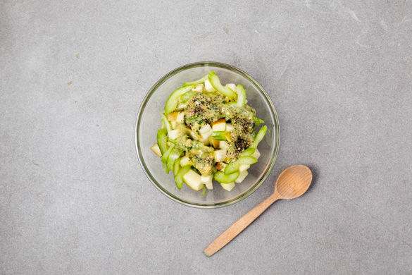 Den Sellerie schräg in möglichst dünne Scheiben schneiden. Den Apfel vierteln, entkernen und in ca. 1cm große Würfel schneiden. Das Dressing mit dem Sellerie und den Apfelwürfeln verrühren und erneut mit Salz und Pfeffer sowie Zitronensaft abschmecken.