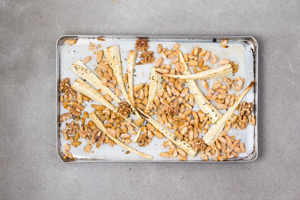Die Walnüsse zum Gemüse auf das Blech geben und für 5–8Min. mitrösten, bis alles goldbraun und gar ist. Die Petersilienblätter fein hacken.