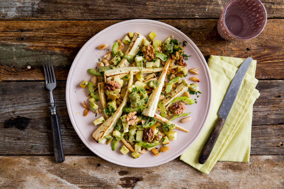Der beste Beweis, dass Salat auch im Winter schmeckt – und eine echte Vitaminbombe noch dazu! Mit Thymian gebackene Pastinaken und Cannellinibohnen werden kombiniert mit knackigem Staudensellerie und Apfel, gerösteten Walnüssen und einem fein-cremigen Misodressing. So bleibst du fit und gut gelaunt.