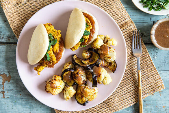 Was passiert, wenn zwei Welten aufeinandertreffen? Diesen köstlichen Versuch kannst du heute wagen, wenn du das warme, weiche Hefebrötchen mit knusprig-frittiertem Hähnchenschenkel im Mund vereinst. Ein süßlich-fruchtiges Dattelchutney passt herrlich zu dem milden Currygeschmack des Fleisches und auch die Röstaromen von Aubergine und Blumenkohl tragen ihr Scherflein für ein kontrastreiches Geschmackserlebnis bei.