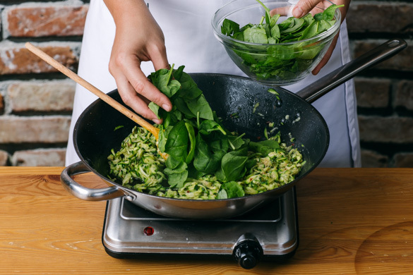 Die Zucchini, den Knoblauch und 1 Prise Chiliflocken zu den Sardellen in die Pfanne geben und alles 3–5Min. braten, bis die Zucchini gar ist. Dann den Spinat nach und nach zugeben und zusammenfallen lassen. Mit Salz und Pfeffer sowie den restlichen Chiliflocken nach Geschmack würzen. Vorsicht, die Chiliflocken sind sehr scharf.