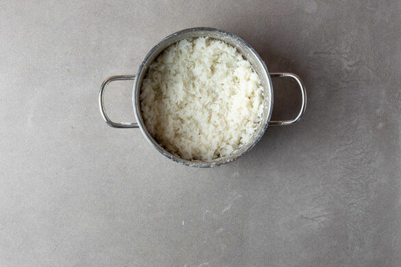 Währenddessen in einem zweiten kleinen Topf 400ml leicht gesalzenes Wasser zum Kochen bringen. Den Reis in einem Sieb kalt abspülen, bis das Wasser klar bleibt. Sobald das Wasser kocht, den Reis hineingeben und abgedeckt bei niedrigster Hitze 10–12Min. kochen, bis das Wasser aufgesogen und der Reis gar ist. Noch ca. 5Min. ohne Hitzezufuhr ziehen lassen.
