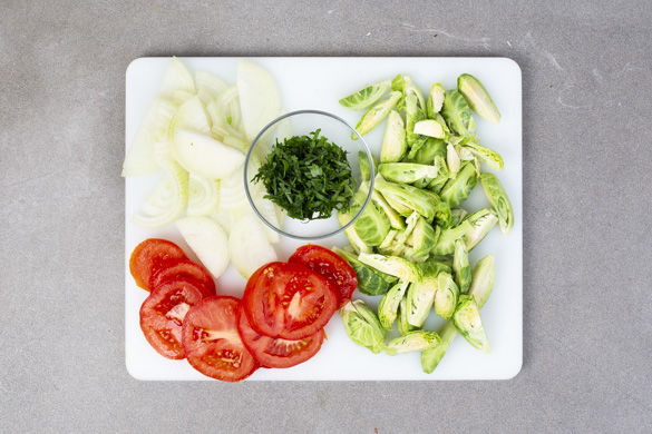 Den Backofen auf 220°C Umluft (240°C Ober-/Unterhitze) vorheizen. Die Zwiebeln schälen, halbieren und in Streifen schneiden. Die Tomate vom Strunk befreien und in dünne Scheiben schneiden. Den Rosenkohl unten sparsam abschneiden, ggf. die äußeren Blätter entfernen und die Röschen der Länge nach vierteln. Die Petersilienblätter abzupfen und fein hacken.
