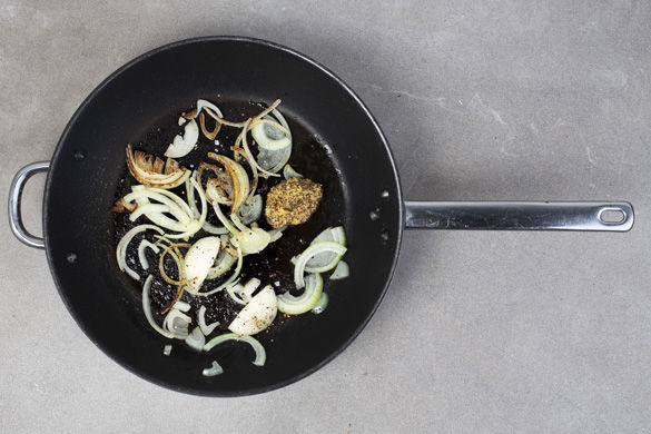 Die Zwiebeln in einer mittelgroßen Pfanne mit ca. 1EL Olivenöl bei mittlerer Hitze für 2–3Min. anbraten. Die 1/2 des Senfs dazugeben und verrühren, mit Salz und Pfeffer würzen. Die Zwiebeln aus der Pfanne nehmen und beiseitestellen.