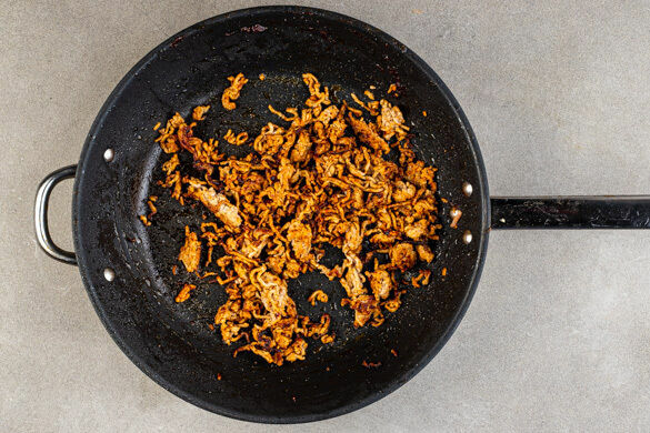 Die Chilipaste in einer zweiten mittelgroßen Pfanne mit 1EL Pflanzenöl bei mittlerer bis starker Hitze ca. 30Sek. anbraten, dann das Hackfleisch zugeben und unter Rühren in ca. 4Min. gar braten.