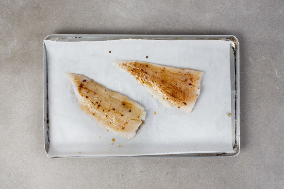 Den Fisch unter kaltem Wasser kurz abspülen, mit etwas Küchenkrepp trocken tupfen und auf ein mit Backpapier ausgelegtes Backblech geben. Das Harissapulver mit 1TL Olivenöl mischen und den Fisch gleichmäßig mit dem Harissaöl bestreichen. Salzen und beiseitestellen.