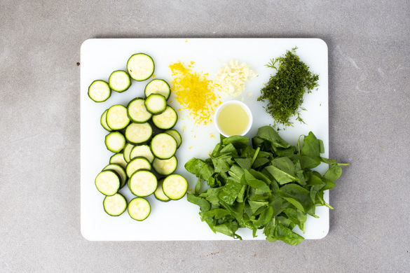Die Zucchini in ca. 0,5–1cm dicke Scheiben schneiden. Den Knoblauch schälen und fein hacken. Den Dill samt Stängeln fein hacken. Den Spinat grob hacken. Tipp: Wer mag, kann den Spinat auch ganz lassen. Die Zitronenschale abreiben, dann die Zitronen halbieren und auspressen.