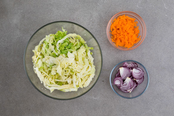 Den Wirsing von Strunk und dickeren Stellen befreien und in feine Streifen schneiden. Die Karotten schälen und grob raspeln. Die Zwiebeln halbieren, schälen und in feine Streifen schneiden.