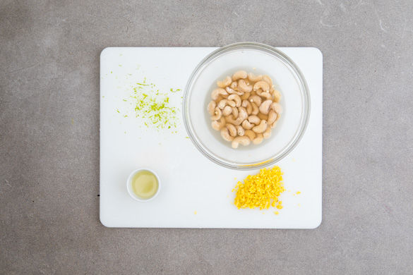 Den Backofen auf 200°C Umluft (220°C Ober-/Unterhitze) vorheizen. 200ml Wasser in einem Wasserkocher zum Kochen bringen. Das Wasser in eine hitzefeste Schüssel geben, die Cashewkerne hineingeben und beiseitestellen. Den Ingwer schälen und grob hacken. Die Limettenschale abreiben, dann die Limette halbieren und auspressen.