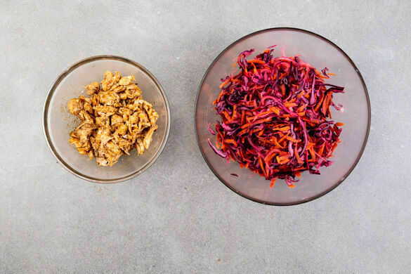 Bunt geht es zu auf deinem Teller heute! Da tummeln sich knackiger Rotkohlsalat mit Karotten und eingelegten Zwiebeln, fruchtige Tomaten-Koriander-Salsa mit einem Hauch Limette und als Platzhirsche knusprig gebackene Süßkartoffeln, herzhaft gefüllt mit saftigem Bio-Hähnchenbrustfilet. So klappt es mit den kulinarischen Frühlingsgefühlen auch an trüben Tagen!