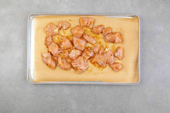 Das Fleisch trocken tupfen, in mundgerechte, nicht zu kleine Stücke schneiden und mit der ½ der BBQ-Sauce, 2TL Olivenöl sowie je 1 kräftigen Prise Salz und Pfeffer vermengen. Auf einem zweiten mit Backpapier ausgelegten Backblech verteilen und 15–20Min. unterhalb der Süßkartoffeln im Ofen garen.