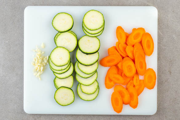 Die Karotten ggf. schälen und leicht schräg in hauchdünne Scheiben schneiden. Die Zucchini in dünne Scheiben schneiden. Den Knoblauch schälen und fein würfeln.