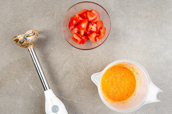 Die Schalotte und den Knoblauch schälen und grob würfeln. Die ½ des Ingwers grob würfeln. Die Peperoni entkernen und grob würfeln. Das Zitronengras und die Tomaten grob würfeln. Die Limettenschale abreiben. Ca. ¼ der Tomaten mit den übrigen Zutaten in ein hohes Gefäß geben und mit 1EL Pflanzenöl, 1EL hellem Essig, 1TL Zucker und ½ TL Salz pürieren.