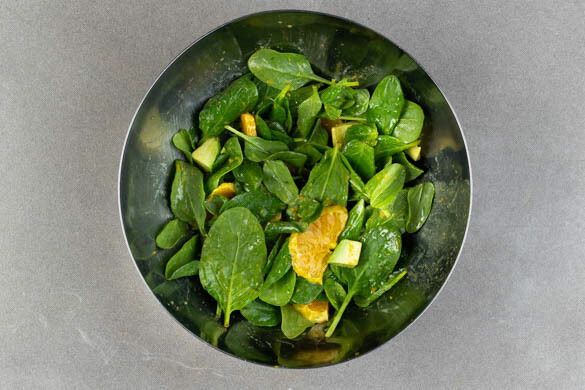 Die Avocado halbieren, den Kern entfernen und das Fruchtfleisch in der Schale kreuzweise einschneiden. Die vorgeschnittenen Avocadowürfel mit einem Löffel aus der Schale lösen und mit dem Spinat vorsichtig unter das Dressing heben.