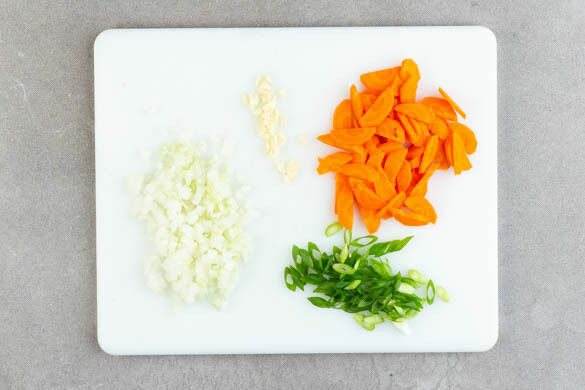 Die Zwiebel und den Knoblauch schälen, halbieren und in feine Würfel schneiden. Die Karotte ggf. schälen, längs halbieren und schräg in dünne Scheiben schneiden. Die Lauchzwiebel in feine Ringe schneiden.