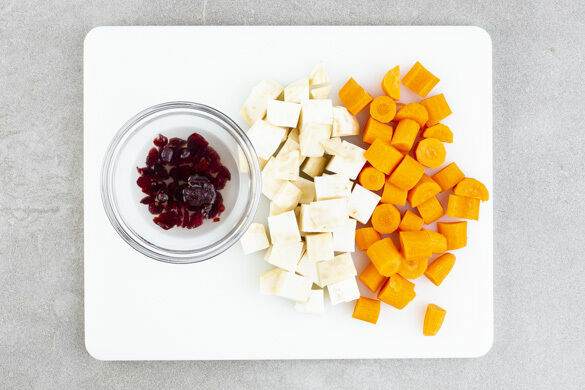 Den Backofen auf 240°C (220°C Umluft) vorheizen. Den Sellerie vierteln, schälen und in mundgerechte Würfel schneiden. Die Karotte ggf. schälen und in gleich große Würfel schneiden. Die Cranberrys in etwas warmem Wasser einweichen.