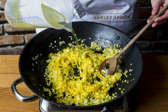 Die Zwiebeln in einer großen Pfanne mit 1EL Olivenöl bei mittlerer Hitze ca. 2Min. glasig anbraten. Den Reis und den Knoblauch dazugeben, kurz mitrösten, dann mit dem Safranwasser ablöschen und weitere 1–2Min. braten.