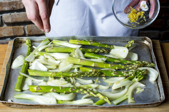 Zwischendurch die Zitronenschale abreiben, dann die Zitrone in Spalten schneiden. Den Spargel und den Fenchel auf einem Backblech mit 1EL Olivenöl und der Zitronenschale nach Geschmack vermengen und mit je 1 Prise Salz und Pfeffer würzen. Im Ofen 10–15Min. grillen, bis das Gemüse goldgelb und leicht knusprig ist.