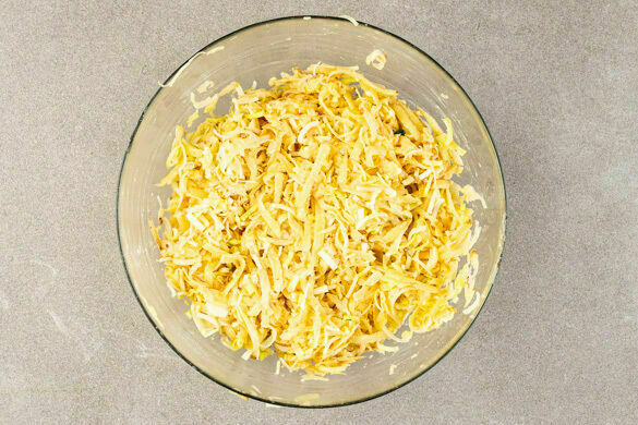 Den Lauch jeweils längs vierteln, dann quer in ca. 0,5cm breite Streifen schneiden und mit den Kartoffeln, 2 Eiern sowie je 1TL Salz und Pfeffer vermengen. Das Mehl unterrühren und alles gut vermischen.
