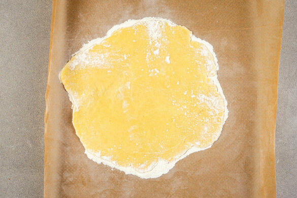 Ein ausreichend großes Stück Backpapier mit ½EL Mehl bestäuben. Den Teig auf das Backpapier legen, mit dem übrigen Mehl bestäuben und zu einem Kreis von ca. 28cm ausrollen. Tipp: Falls der Teig zu klebrig ist, ggf. mit mehr Mehl bestreuen. Es ist okay, wenn am Rand Risse entstehen.