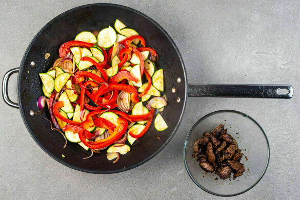 Das Fleisch in einer großen Pfanne bei starker Hitze ca. 2Min. scharf anbraten, aus der Pfanne nehmen und beiseitestellen. Die Paprika, die Zucchini, die Zwiebeln und den Knoblauch in derselben Pfanne mit 2EL Olivenöl bei mittlerer Hitze 2–3Min. anbraten.