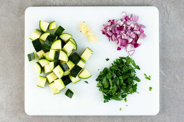 Die Zucchini längs vierteln und in ca. 2cm große Stücke schneiden. Die Zwiebel schälen, halbieren und grob würfeln. Den Knoblauch schälen und fein würfeln. Die Petersilie samt Stängeln grob hacken.