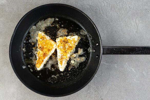 In einer mittelgroßen Pfanne 2EL Olivenöl stark erhitzen und den Käse auf jeder Seite 1–2Min. knusprig und goldbraun anbraten.