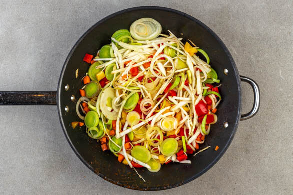 Den Gemüsemix in der Pfanne mit 2EL Pflanzenöl bei starker Hitze 2–3Min. scharf anbraten.