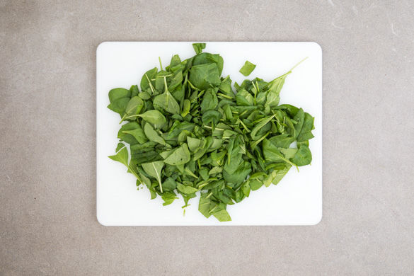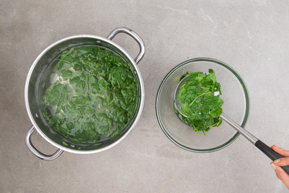 Das Wasser leicht salzen und die Temperatur auf mittlere Stufe reduzieren. Den Spinat hineingeben und ca. 2–3Min. gar ziehen lassen, dann mit einer Schaumkelle herausnehmen und beiseitestellen. Das Wasser für die Pasta erneut zum Kochen bringen.