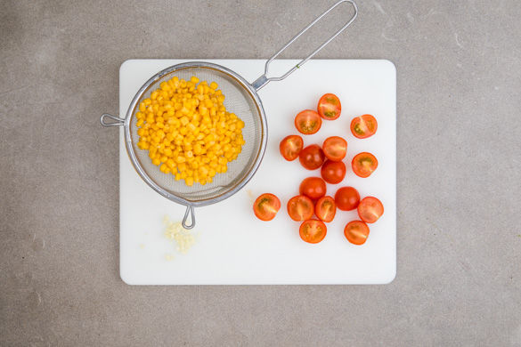 Die Kirschtomaten halbieren. Den Knoblauch schälen und fein hacken. Den Mais in einem Sieb abtropfen lassen.