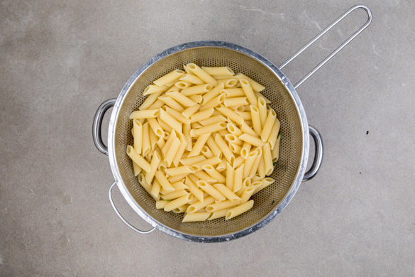 Sobald das Wasser erneut kocht, die Nudeln hineingeben und in ca. 7–9Min. bissfest kochen. In ein Sieb abgießen und abtropfen lassen. Den Käse fein reiben.