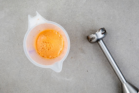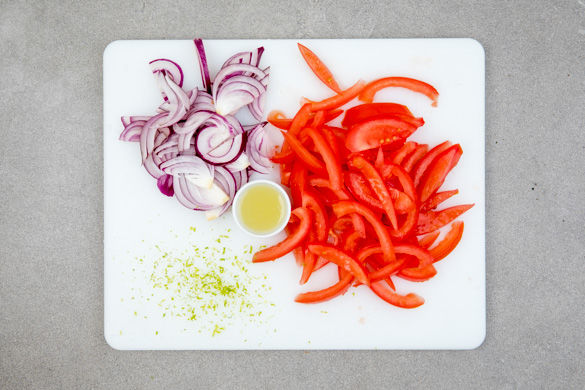 Die Tomaten vierteln und den Strunk entfernen. Das flüssige Innere mit den Kernen in ein hohes Gefäß geben, das Fleisch in 0,5cm breite Streifen schneiden. Die Zwiebel schälen, halbieren und in feine Streifen schneiden. Die Limettenschale abreiben, dann die Limette halbieren und auspressen.